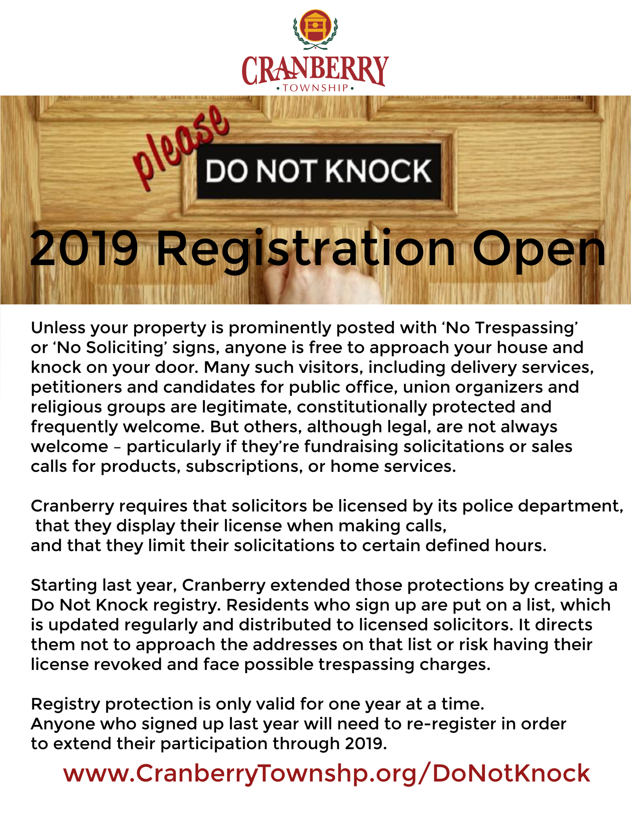Please find attached a flier with more information on our Do Not Knock program, that you may share with residents. Registration is now open for 2019. If residents signed up in 2018, they must sign up again if they’d like to continue to participate.